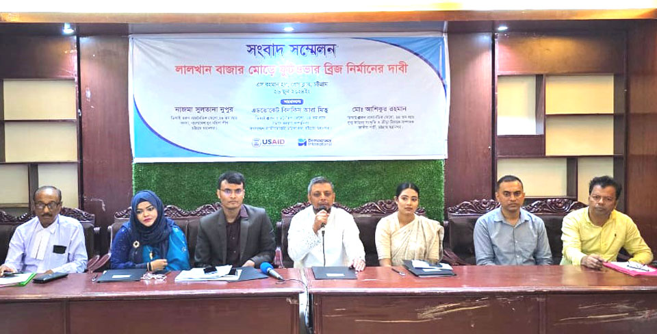 সংবাদ সম্মেলনে তারা চট্টগ্রাম নগরীর লালখান বাজার মোড়ে দীর্ঘদিনের জনদুর্ভোগ লাঘব, দূর্ঘটনা প্রতিরোধ, যানজট নিরসন, পথচারী পারপার নির্বিঘ্ন করতে অনতিবিলম্বে একটি ফুটওভার ব্রিজ নির্মানে প্রয়োজনীয় ব্যবস্থা গ্রহনে চট্টগ্রাম সিটি কর্পোরেশন ও সিডিএ’র নিকট জোর দাবি জানান।